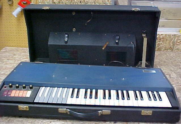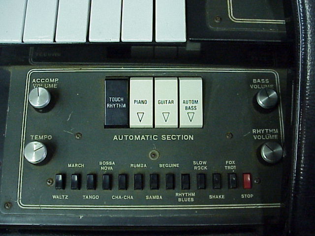 of them!. A veritable chromatic feast for the eyes! The 800 appears to be the top-of -the-line model, or nearly so, at least. Featuring several different Organ and Percussion voices in 6 diffferent footages, with percussion repeat and legato percussion, it also sports four Sustain voices, with short or long sustain. Even the lower keyboard has it's own complement of four flute footages plus a separate "Bass" voice. It also features an Arpeggio/Glissando strip under the lower manual - very much like that found on the Cordovox CDX-0642. Many thanks to K. Diesel of Hot Rod Moses for these pictures. |