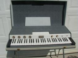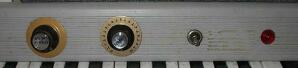 Dubbed "the mysterious Doric" by Barry Carson, it's not such a mystery any more. There were at least six different models, and rumor has it there was a double-keyboard model as well. The Ekosonic's I've found seem to be twins to the Doric's, differing only cosmetically. I suspect the Doric's may also be related to the Howard, primarily because they look very similar (same sort of profile, dished tabs in the middle, knobs on the front panel), and both include a pull-out coupler, which is a rather unusual feature for a combo organ. In addition to the combo's feature here, they made at least two console/spinet organs. The three models were also available in a "MIX" version, which is described as "Same as the (model name) with a triad (mix) added to each treble tone." It's suspected that this may mean that each note actually plays a triad (root-third-fifth, aka major chord). I'm not sure just how useful this would be. It's also possible that the "Single Tone" tab, shown below on the 65PS model, may turn this feature on and off.