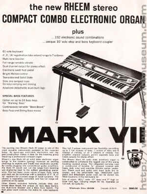 "Meanwhile, Califone/Roberts realized that guitar amplifiers were well suited to being manufactured there, so they designed a few amplifiers and attempted to market them. They were not as successful in this pursuit as they had been with other products, because they had no one there who knew anything about the guitar amplifier market or what was really needed. At some point the existing Califone/Roberts operation was purchased by Rheem. I don't know any of the details of this, except now the company became Rheem/Califone/Roberts. All the old staff were retained including the managers. A couple of new managers were added. One of the new managers claimed to know something about the music industry. He convinced the other managers that the new company should pursue the music business by making products under the Rheem name. They could start with the guitar amplifiers which were already in production. Based on their success with importing, they could have other products made in Japan for distribution and sale by Rheem out of the Bowcroft St. facility. It was at this point that I became involved with Rheem/Califone/Roberts. I was hired by the Chief Engineer, not by management. I had been hired to design a new line of guitar amplifiers. I took on this job with a passion..." " I got kind of a reputation as I had "pickers" coming and going into engineering to test concepts. My theory was that nobody knows better what they want in a product than the people that use them. Thus, the new Rheem guitar amps were really designed by guitarists - all I had to do was translate their language into engineering language. It wasn't easy but it sure was fun. :-) Example: Translate into engineering criteria this sentence, "Hey dude you gots da twang OK but youse needs mo' funk." The new manager of the Musical Instruments department naturally kept a close eye on what I was doing, and figured it was in his domain. He had a couple of Japanese companies build him samples of a "Combo Organ" he wanted to market, but what he received was far short of his expectations. He tried to involve me in the project, but the Chief Engineer would have none of it. We were almost finished with the guitar amplifier designs, which were quite radical, and he didn't want to see my efforts diverted. I was, however, very interested in the organ project, and wanted to get involved somehow. I had become friends with the General Manager of the company, who was a Radio Amateur and organ hobbyist. I had a talk with him about my dilemma, and he suggested I take the prototypes home and use the parts to construct something closer to what I and the Musical Instrument manager thought we wanted. He said Art, (The Chief Engineer.) couldn't object to this. Pitney, (The General Manager.) was also very interested in my ideas for future musical products, and said that if the first products were successful even slightly, it might open the way for some kind of research program. This was all I needed so after talking it over with the others involved, I took the three prototypes home and built what became the Rheem Mark VII organ. I also showed them a prototype of a pedal bass instrument I had designed before I came there, intended to be placed under a piano. This design became the Kee Bass, though this was not what I intended. Under the Rheem name, they also imported some guitars, which were not very good quality.