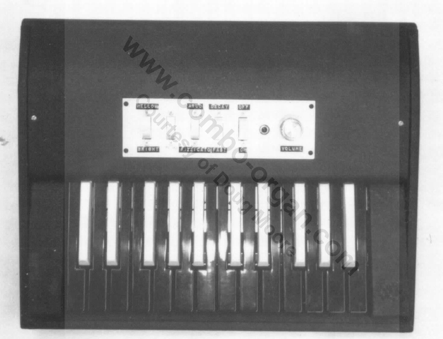 | Not really a combo organ, but just too neat to pass up. It's only claim to fame was being used on Devo's "Whip It" video. I've been told that though it appeared in the video, it wasn't actually used on the song. Personally, I think it would have looked cooler if Ray Manzarek had had one of these atop his Continental or Gibson, though admittedly the sound can't compete with the Rhodes. | |