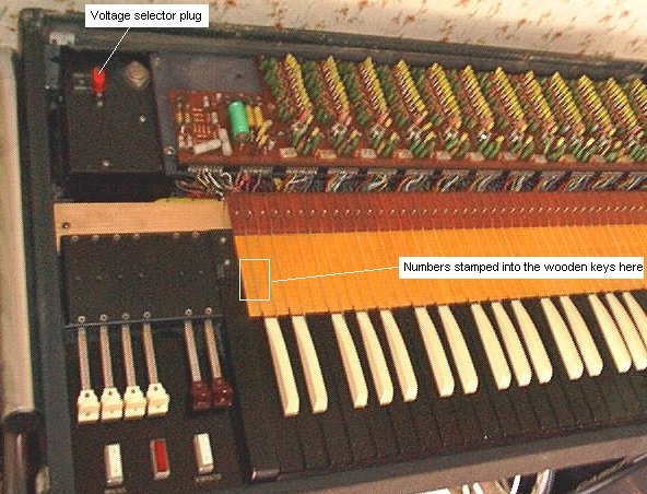 US Models: These are more consistent, all beginning with "97", but as you can see, the numerical order doesn't seem to follow the date sequence. The dates on US models usually come from the left-most key. This may only indicate the manufacture date of the keyboard itself, which may bear no relation to that of the entire organ. I've seen numbers range from 970043 thru 970952.
