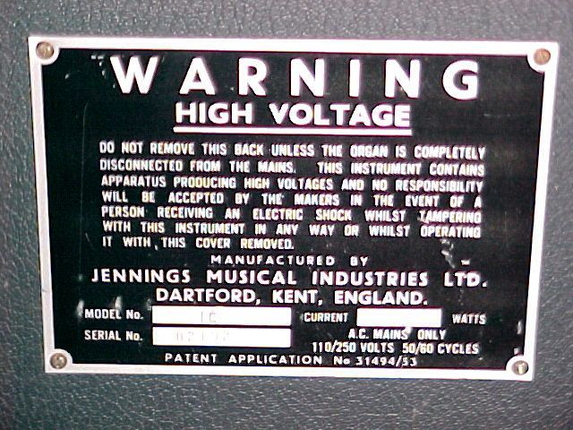 All of the UK models I've seen have either "TC" in the model name, or else the space is blank (examples can be seen below). TC stood for "Transistor Continental" (no, there wasn't a corresponding "valve" version). The designation "V301J", used by some to refer to UK Continentals, was never (as far as I know) used by JMI, and never appeared on any UK ID badge or literature. It was used by Thomas Organ in their service literature to designate the UK models, with the "J" probably standing for "Jennings". The "E" in V301E may have stood for "EME", and the "H" in V301H stood, I'm told, for Hayvenhurst Ave., where the Thomas organ plant was located in Sepulveda, CA. I've seen what I believe was a Vox Sound Continental that had the model designation "STC", which, I presume, stood for "Silicon Transistor Continental".
